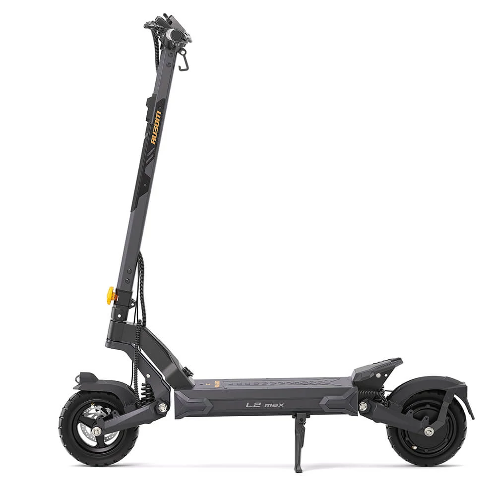 Az Ausom L2 Max Single Motor modell kettős, masszív lengőkaros felfüggesztést használ, amely a repülőgépek futóművének technológiájára épül, így kiváló ütéscsillapítást biztosít és SUV‑szerűen sima haladást nyújt egyenetlen vagy kihívást jelentő útfelületeken. A strapabíró, kovácsolt alumíniumötvözetből készült váz nagy ellenállóságot és akár 130 kg terhelhetőséget kínál, így ideális választás kalandvágyó felhasználóknak. A 10x3 hüvelykes, tömlő nélküli, bütykös mintázatú gumik megerősített kialakításúak, nagy kopás‑ és defektállósággal, ami stabilabb és simább haladást biztosít változatos terepeken.