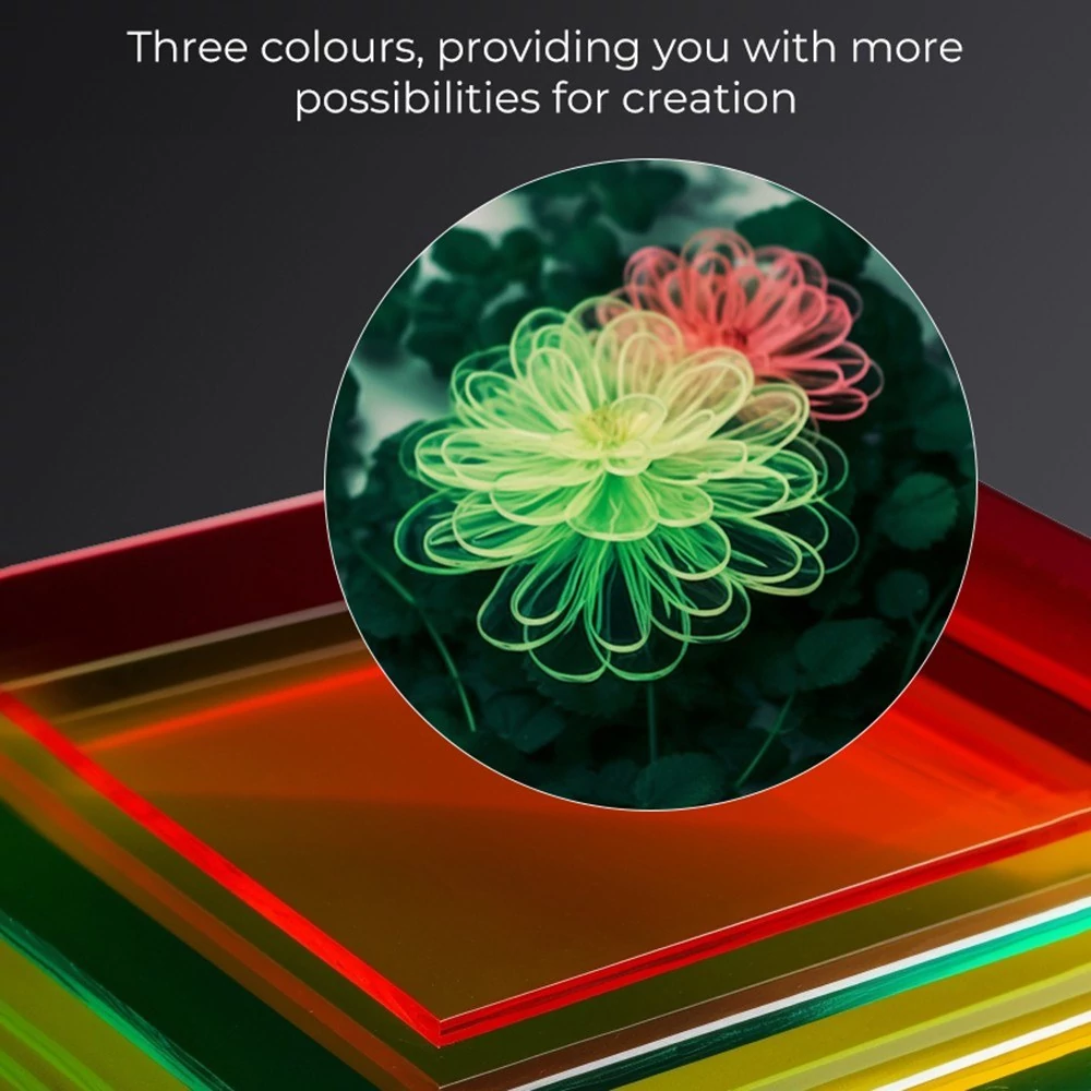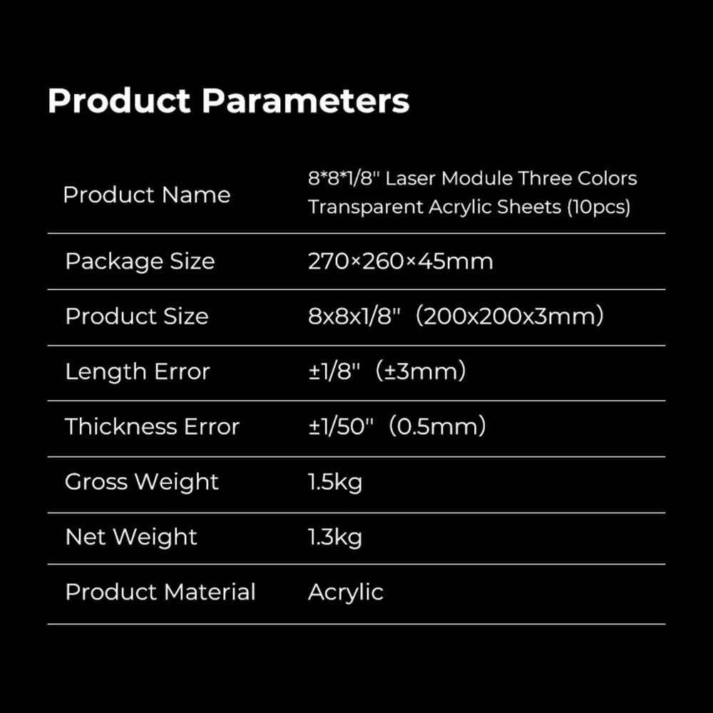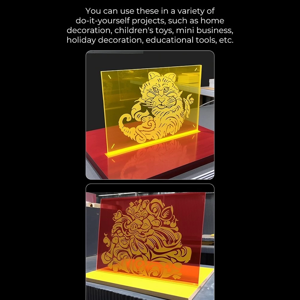 ♦ A 8x8x1/8'' lemezlap különféle létrehozási lehetőségeket biztosít lézergravírozóhoz és 3D nyomtatóhoz. Átlátszó akril tiszta színnel és kiváló fényáteresztő képességgel, alkalmas világító termékek készítésére.