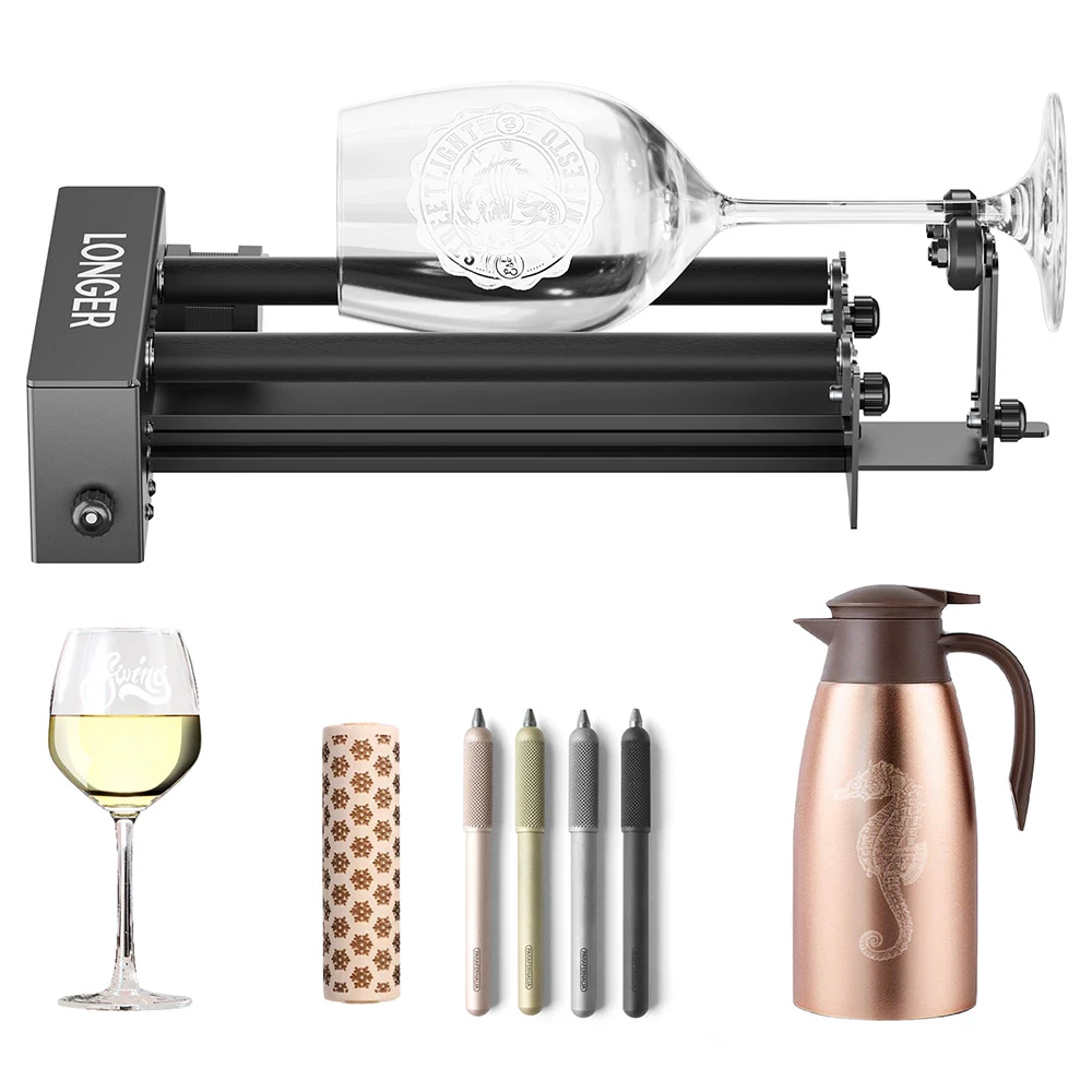 A forradalmian új 360°-os automatikus forgóhengerrel végtelen lehetőségek nyílnak meg, hiszen egyszerűen gravírozhatsz szabálytalan vagy hengeres tárgyakra, például borospoharakra, bögrékre és más felületekre. Tedd alkotásaid igazán egyedivé a személyre szabott gravírozásokkal.