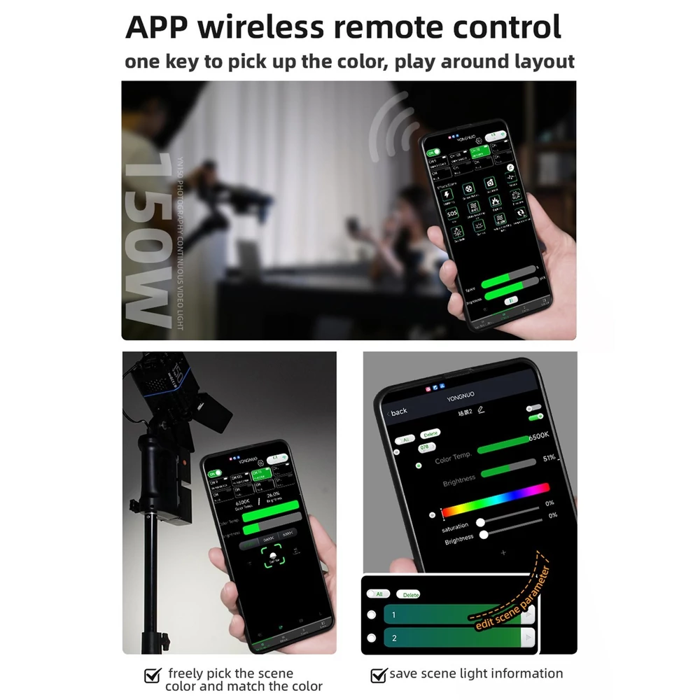 - APP vezeték nélküli távirányító: A LED-es videolámpa támogatja a mobiltelefon APP távirányítóját, amely lehetővé teszi a jelenet színének és a színnek megfelelő szabad kiválasztását, a jelenet fényinformációinak mentését, az áramló fényeffektusok automatikus elrendezését vagy az egyéni effektusokat. Sőt, a fény együtt mozoghat a hanggal APP zenei módban.